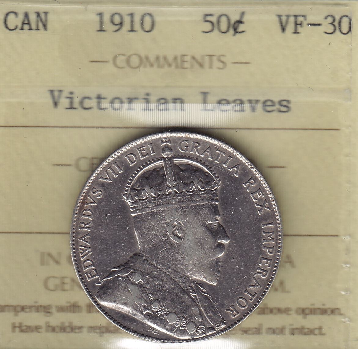 1910 Fifty Cent ICCS VF-30, Victorian Leaves.