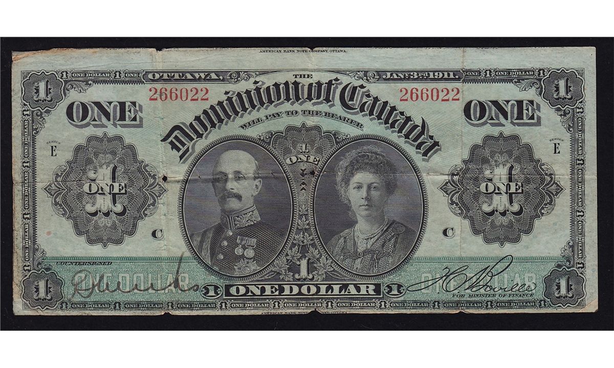 1911 Dominion of Canada $1 - CH DC-18b, Fine, two holes in center from storage in a wallet, staining on back, S/N:266022/C.