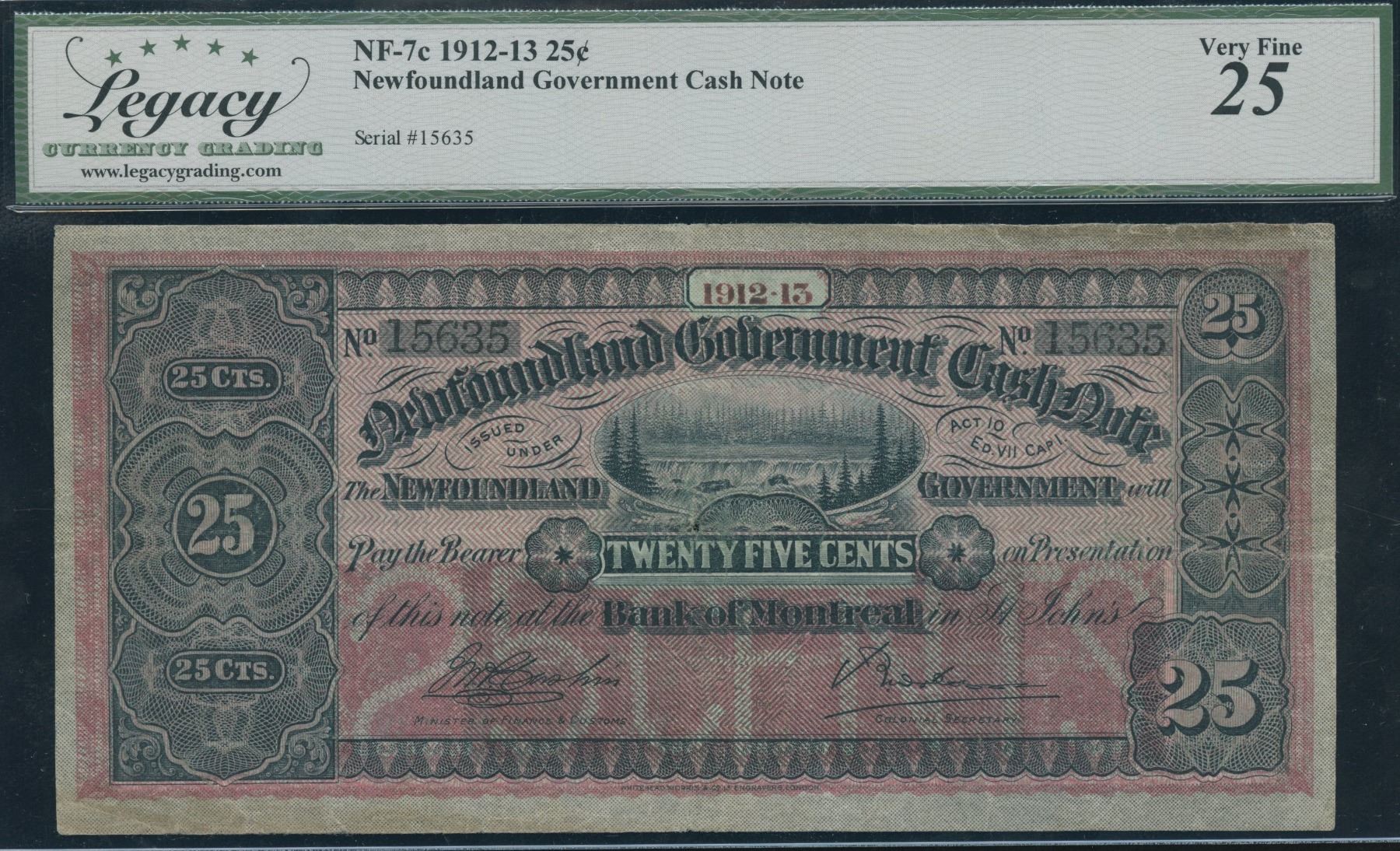 NF-7c. Legacy Very Fine 25. A nice bright VF with a small hole at centre. S/N: 15635.