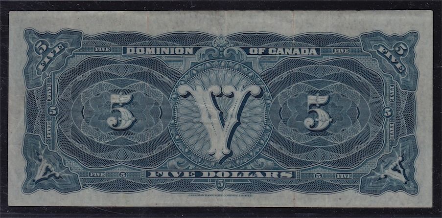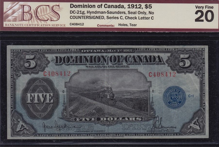 1912 Dominion of Canada $5. DC-21g, Hyndman-Saunders, Seal Only, No Countersigned, BCS Very Fine 20, S/N:C408412/C.