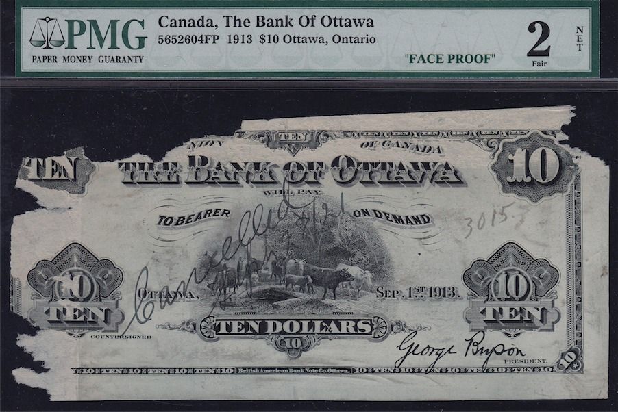 1913 Bank of Ottawa $10 Face Proof. CH 565-26-04FP. Rough and rare, tape Repair, pieces missing. PMG Fair 2 - NET. What you see is what you get - no return. Ex: June 2013 Torex lot #33.
