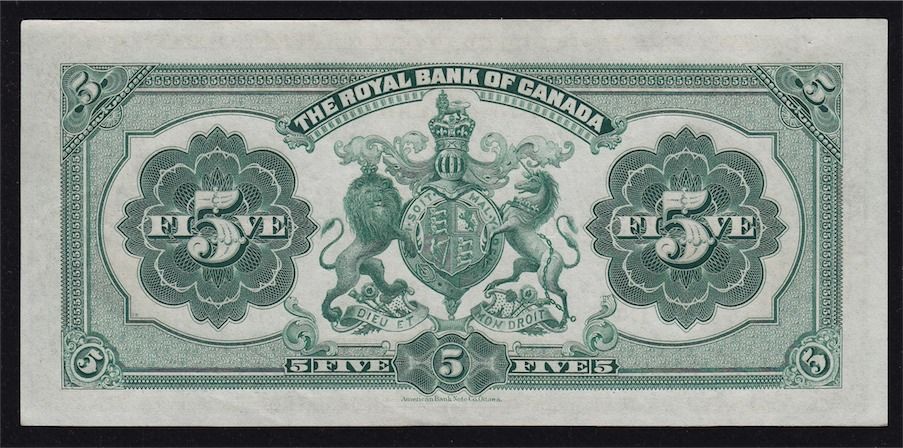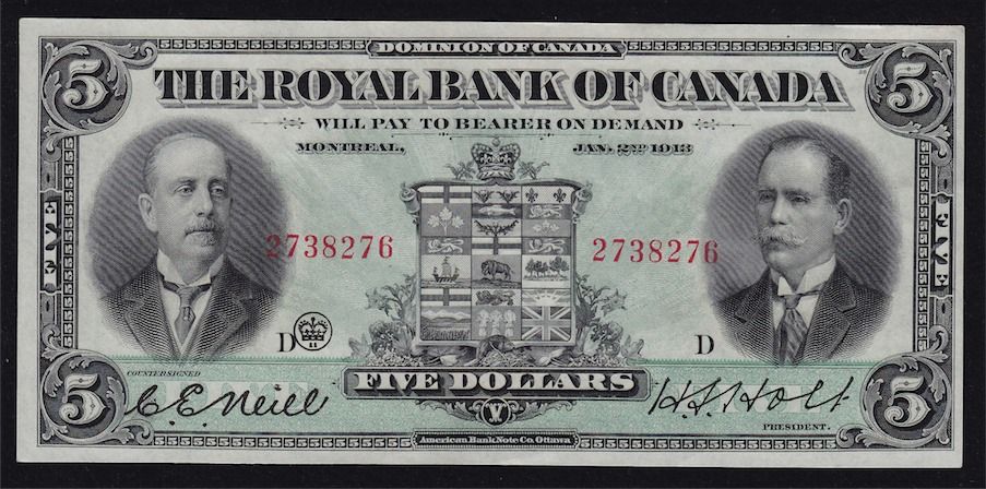 1913 Royal Bank of Canada $5. CH 630-12-04, AU/UNC, Two Pinholes, S/N:2738276/D.