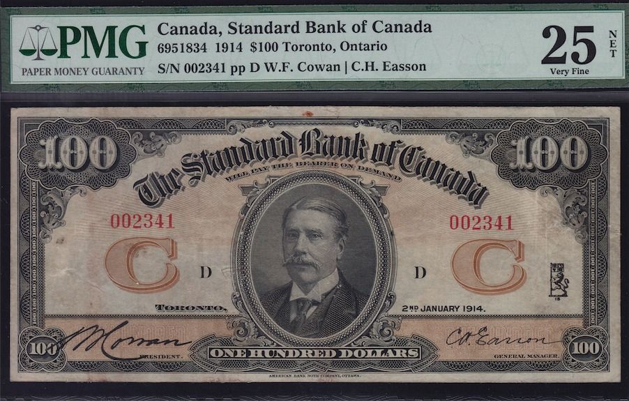 1914 Standard Bank of Canada $100. CH 695-18-34, PMG Very Fine 25 NET, Rust Damage, Repaired. Two notes are known, one is in institutional collection Rare. S/N:002341/D.