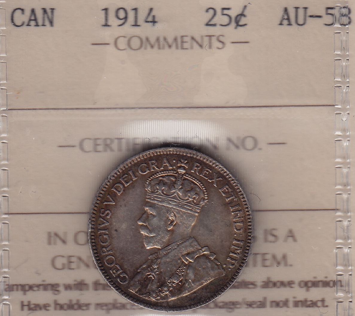1914 Twenty Five Cent ICCS AU-58.