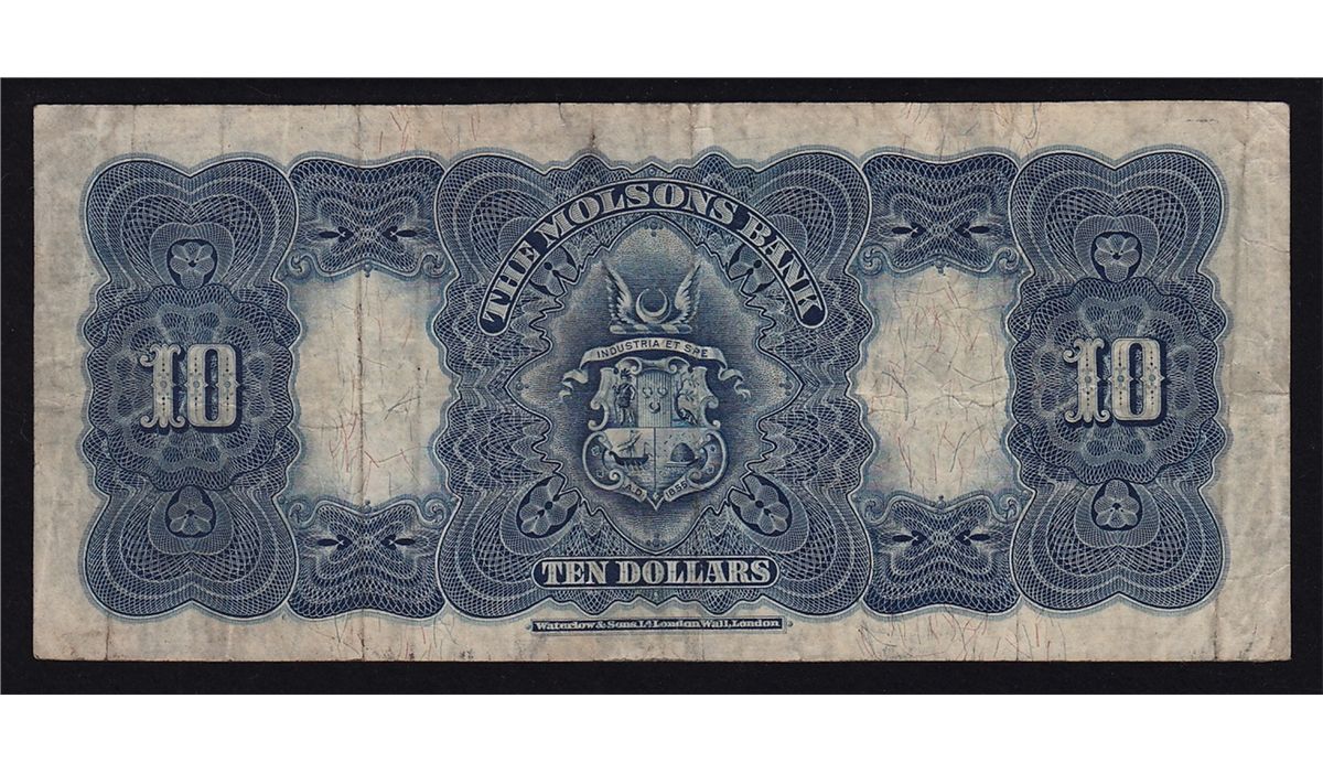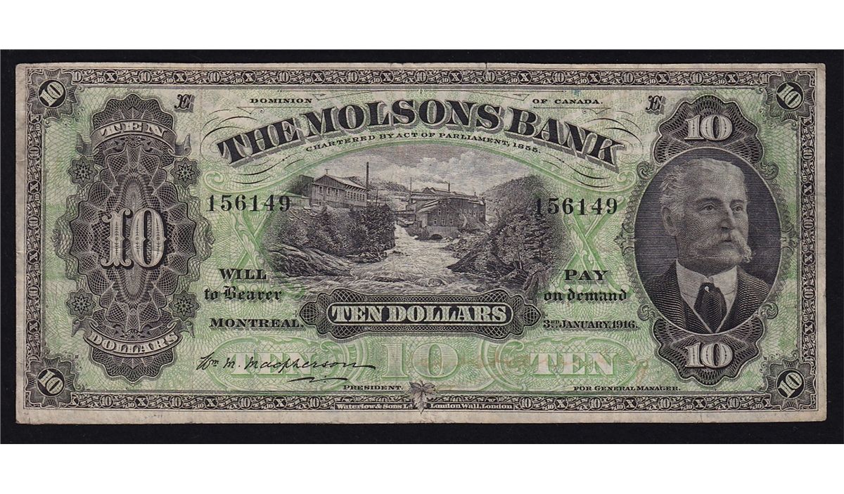 1916 Molsons Bank $10 - CH 490-36-02, VF, small edge tear at top, superb color, S/N:156149/E.