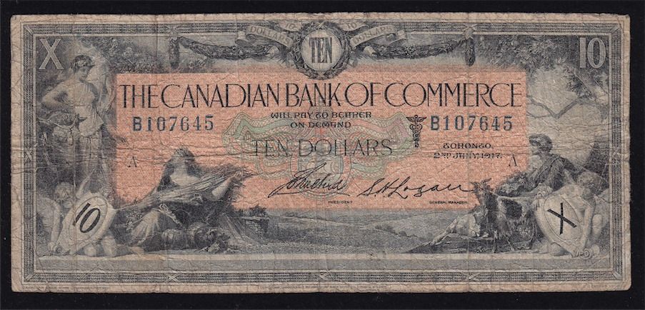 1917 Canadian Bank of Commerce $10. CH 75-16-04b, VG, Large Logan, S/N:B107645/A.