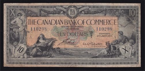 1917 Canadian Bank of Commerce $10 - CH 75-16-04-10a aVF. Rare Rowley signature. General manager typed in italics. 20 recorded on census. S/N:110298.