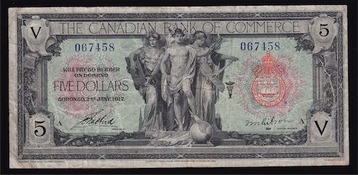 1917 Canadian Bank of Commerce Five Dollars CH 75-16-04-04. Fine/VF, challenging Gibson signature - only 15 on the census. S/N:067458/A.