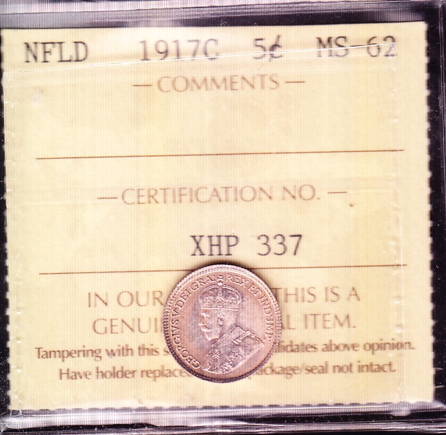 1917C Newfoundland Five Cent - ICCS MS-62. Nice original toning.