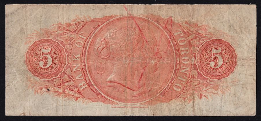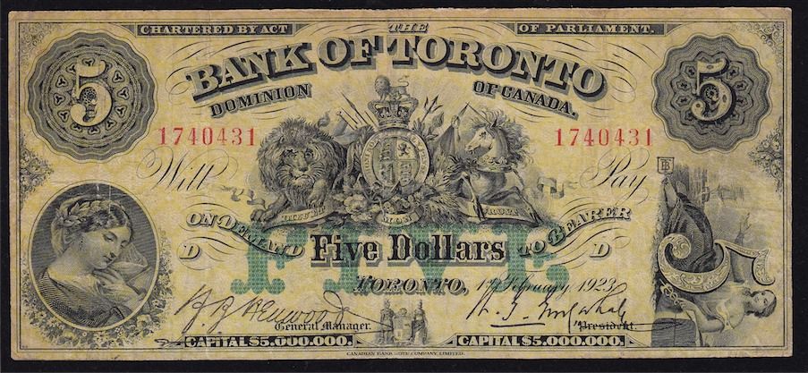 1923 Bank of Toronto $5. CH 715-22-20, F/VF, crayon on back, S/N:1740431/D.