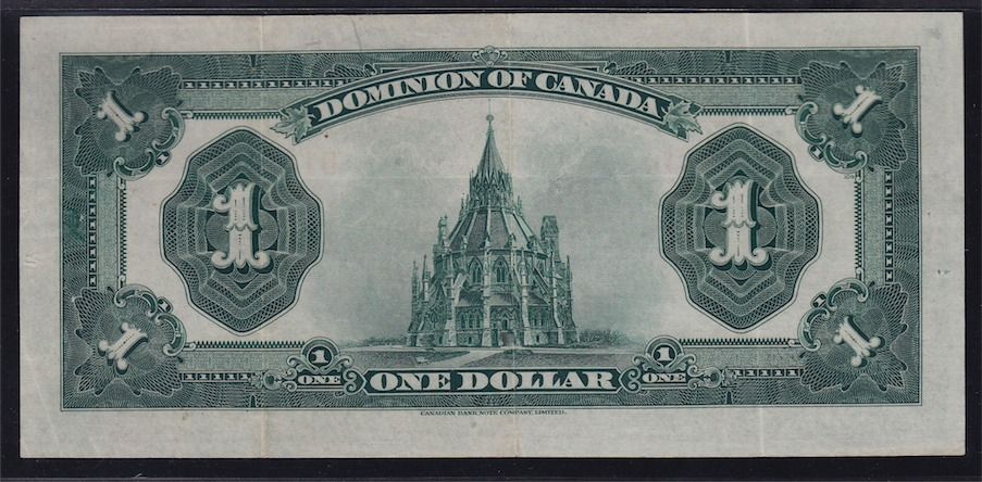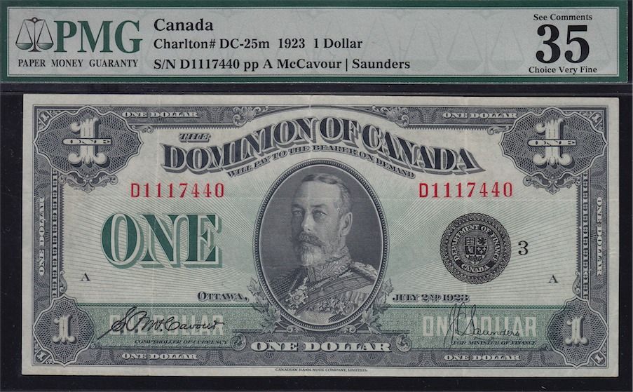 1923 Dominion of Canada $1. DC-25m, Black Seal, Group 3, PMG Choice Very Fine 35, Split in top margin. S/N:D1117440/A.
