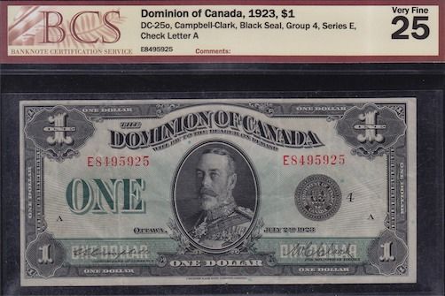 1923 Dominion of Canada $1 - CH DC-25o, Black Seal, Group 4, Series E, BCS Very Fine 25, S/N:E8495925/A.