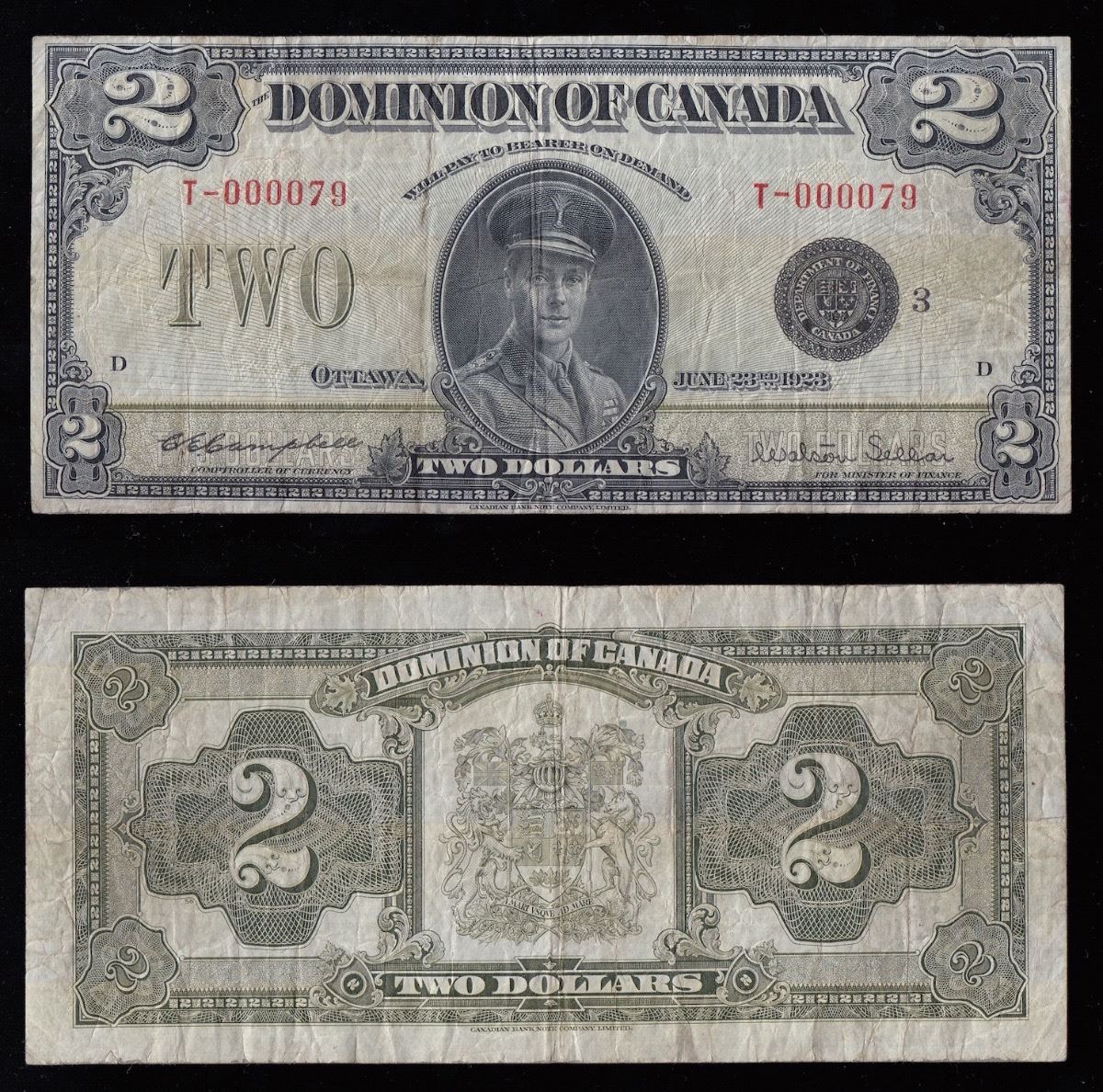1923 Dominion of Canada $2 - Rare Low Serial Number not often seen - DC-26j. Decent Fine. S/N: T-000079 Black Seal, group 3.