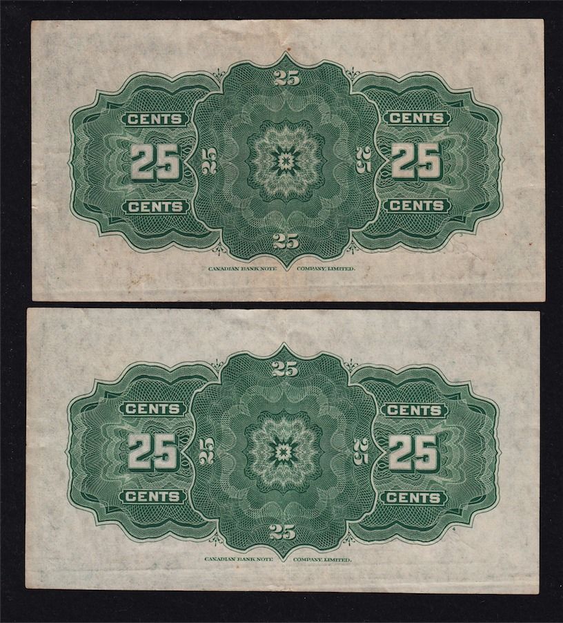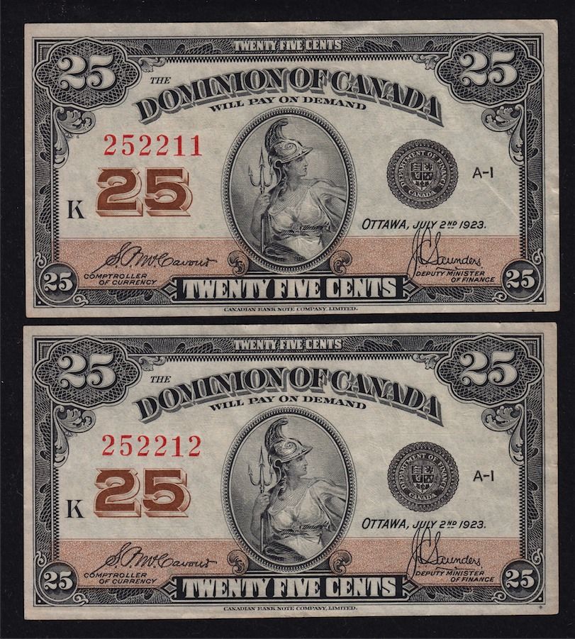 1923 Dominion of Canada 25 Cents Consecutive Pair. DC-24c, EF-AU, S/N:252211-252212. 2 Pcs.