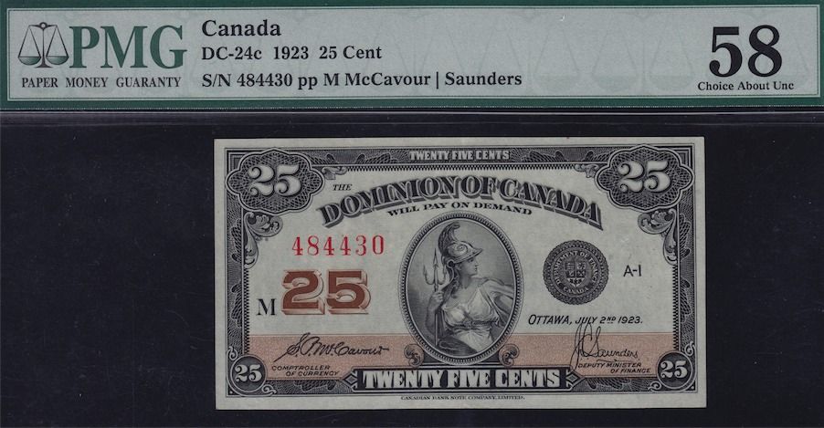 1923 Dominion of Canada 25 Cents. DC-24c, PMG Choice AU58, S/N:484430.