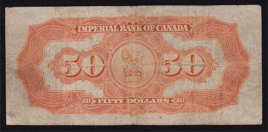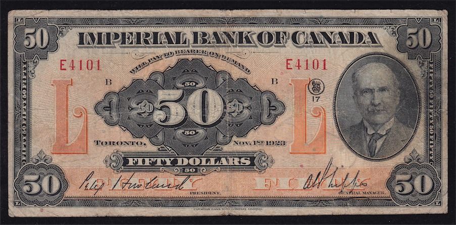1923 Imperial Bank $50. CH 375-18-14, Fine, S/N:E4101/B.