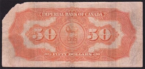 1923 Imperial Bank of Canada $50 - CH 375-18-14. Fine, top right corner torn, the number three circled in pen written on front. S/N:011460/D.