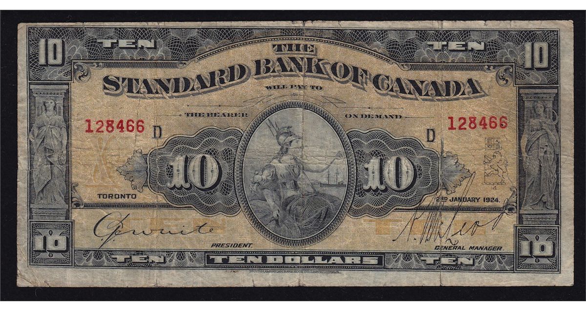 1924 Standard Bank of Canada $10 - CH 695-20-04, 32 on the registry, fine, tear on left side and several small tears on the edges. S/N:128466/D.