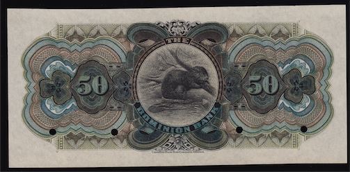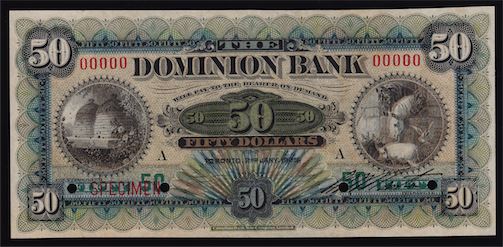 1925 Dominion Bank Fifty Dollars Specimen CH 220-22-04S. Uncirculated, four holes punched at signature area. S/N: 00000/A.