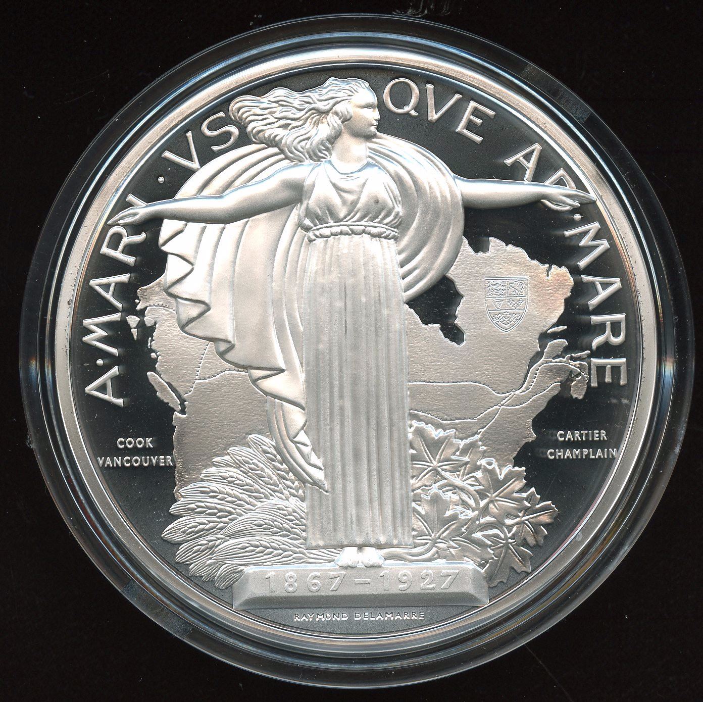 Second low mintage medal in the important historical pieces commemorating Canadian Confederation. This medal features a historical landmark along the path of Canadian history: 1927 Diamond Jubilee of Canadian Confederation. Only 1000 produced. 10OZ (311grams) Pure Silver Proof-like Medal (76.25mm diameter). Original MINT CONDITION encapsulated with Certificate Authenticity & case/box.