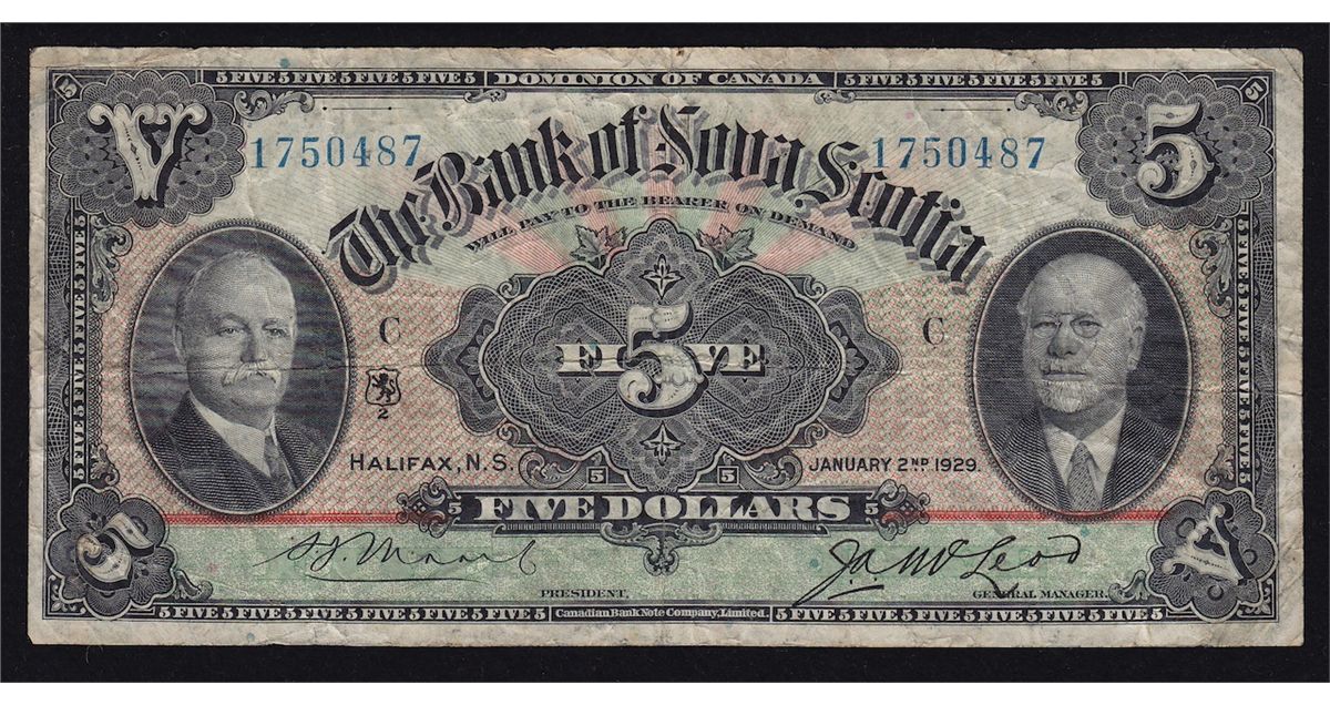 1929 Bank of Nova Scotia $5 - CH 550-34-02, Fine/VF. S/N:1750487/C.