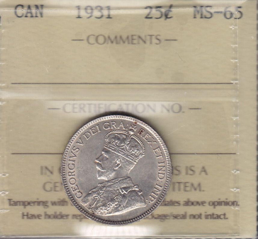 1931 Twenty Five Cent. ICCS MS-65. Just beginning to gently tone. Lots of lustre.