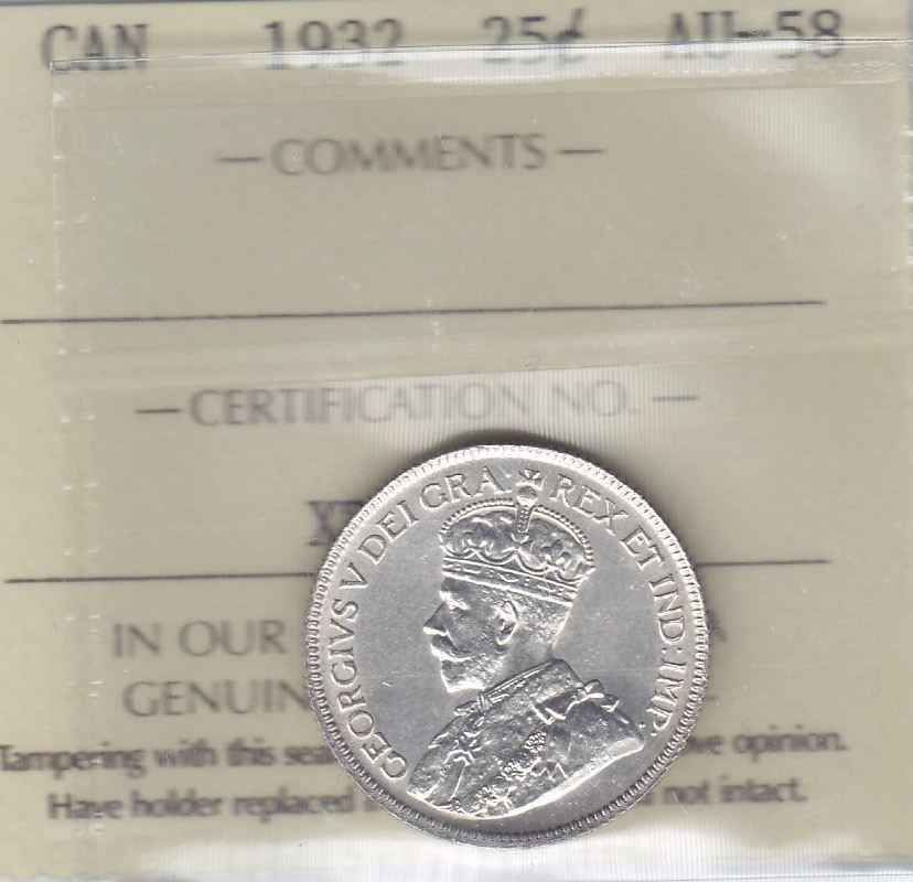 1932 Twenty Five Cents - ICCS AU-58. A remote amount of wear on an otherwise fully struck coin.