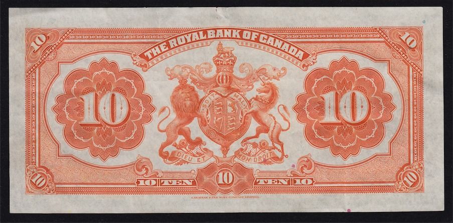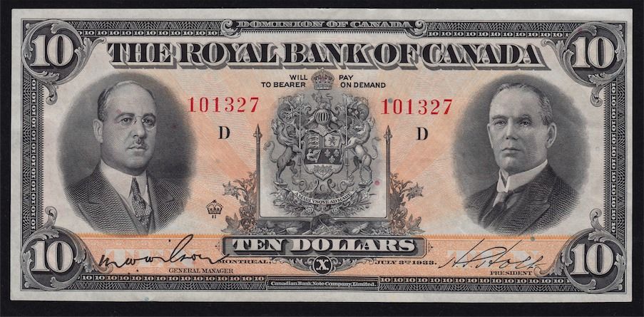 1933 Royal Bank of Canada $10. CH 630-16-04, Fresh and original EF+, 31 Notes recorded, looks undervalued, S/N:101327/D.