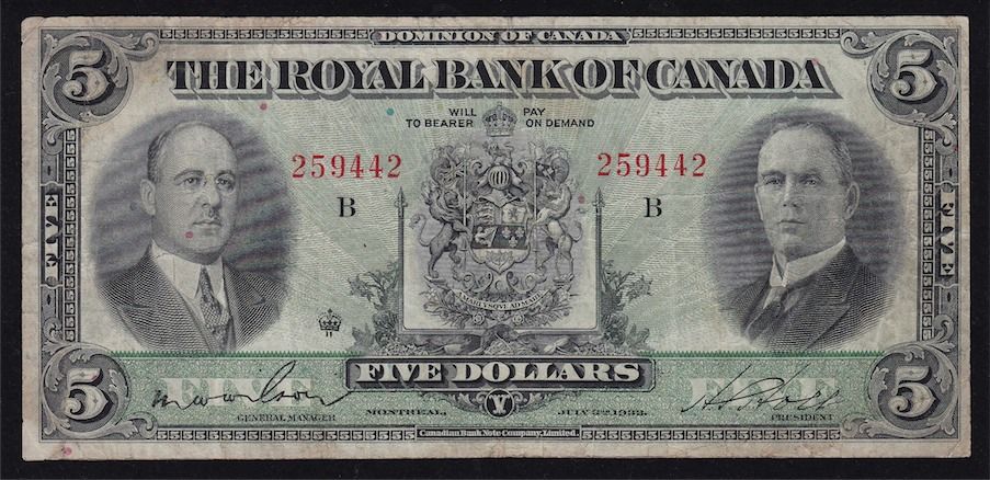 1933 Royal Bank of Canada $5 CH 630-16-02, Pressed VF, S/N:259442/B.
