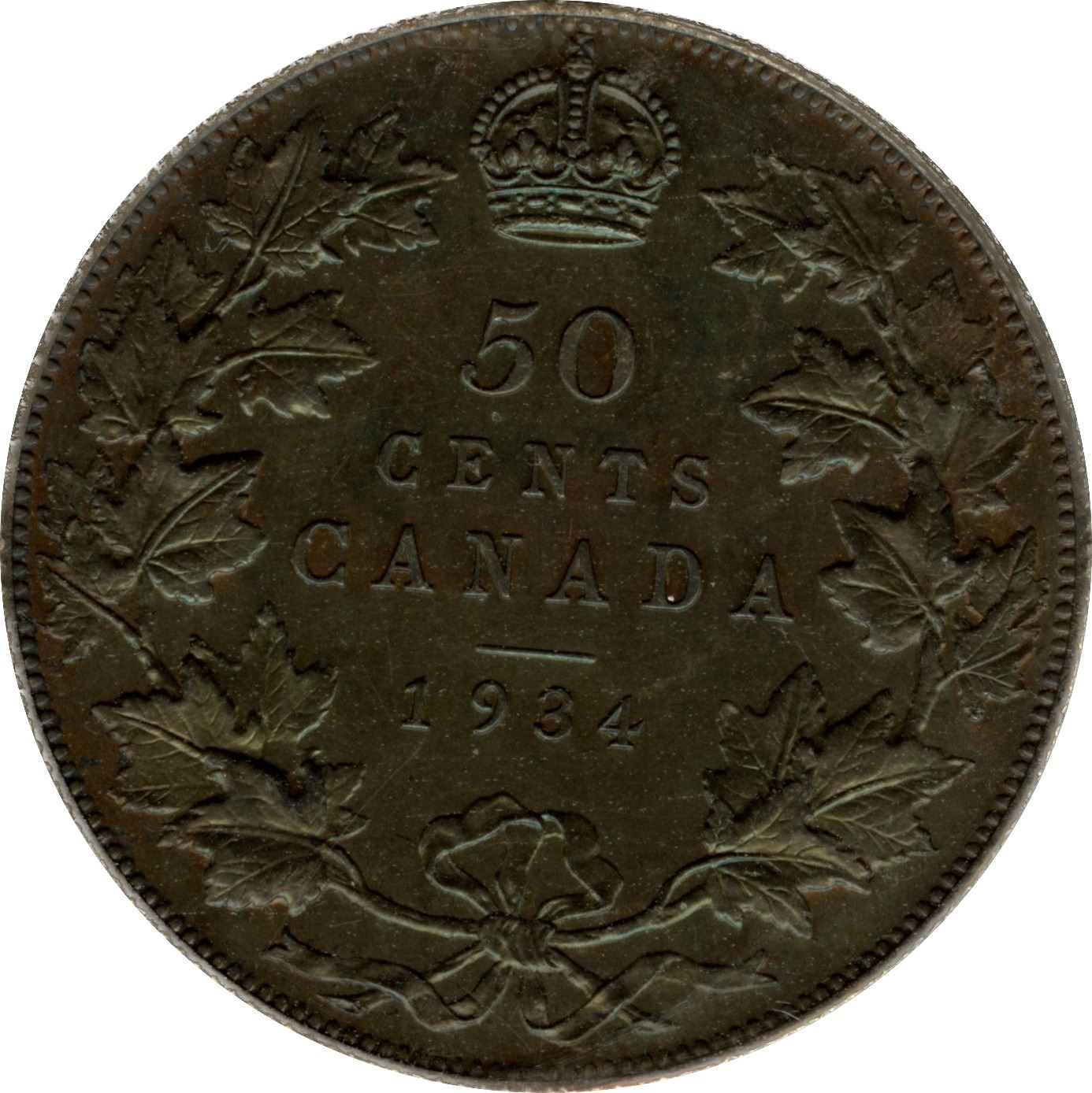 ICCS SP-66. Sharply struck and darkly toned patina. As with all the Specimen George V 50 Cent issue but the 1911 and 1929, the 1934 is extremely rare. Part of the Botany Collection.