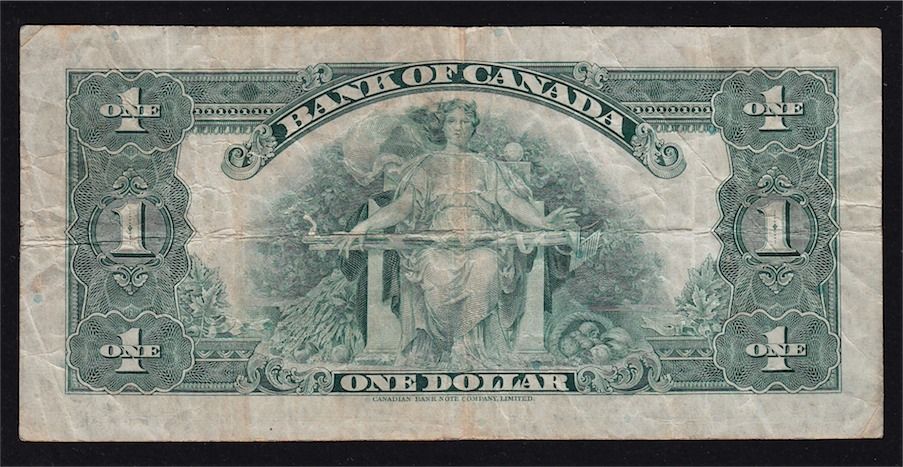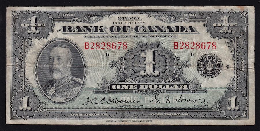 1935 Bank of Canada $1. BC-1, VF, S/N:B2828678/D.