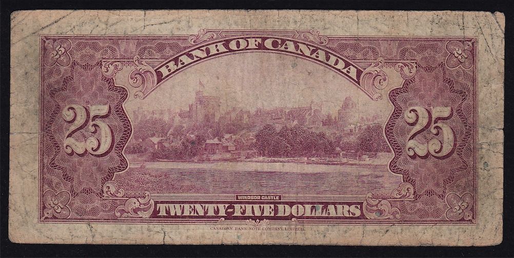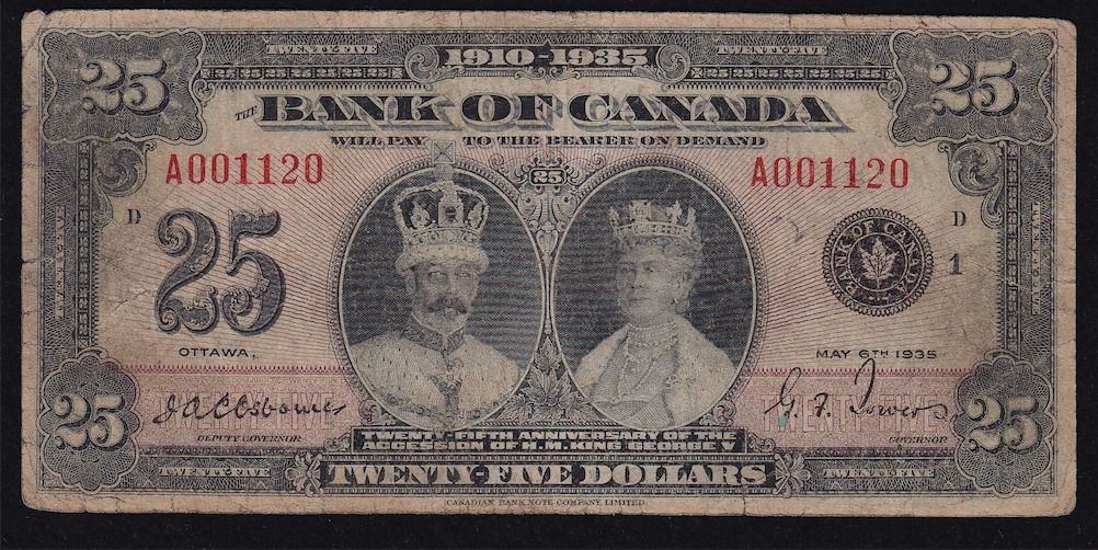 1935 Bank of Canada $25 - CH BC-11 Classic commemorative note. VG, processed. S/N:A001120/D.