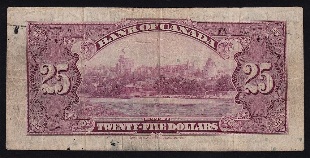 1935 Bank of Canada $25 - CH BC-12. Popular $25 commemorative note in fine condition, some ink marks on back. S/N:A000828/D.