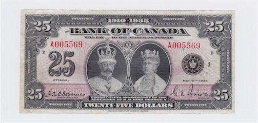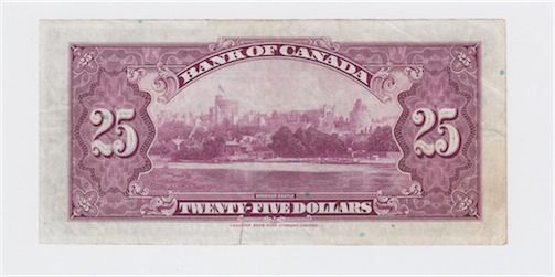 1935 Bank of Canada $25 - CH BC-11. VF, repaired tear at bottom. S/N:A005569/A.
