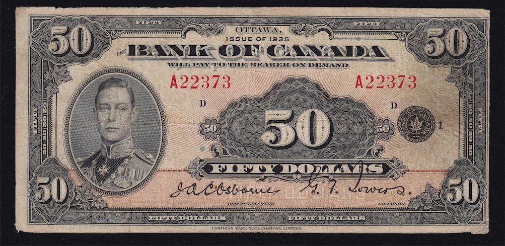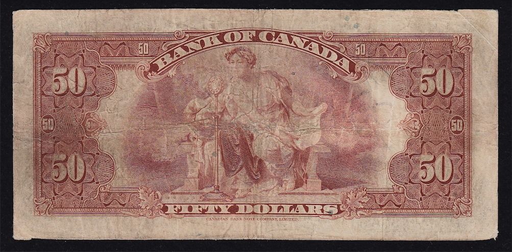 1935 Bank of Canada $50 - CH BC-13 Fine. One pinhole, off-center, pressed. S/N:A22373/D.