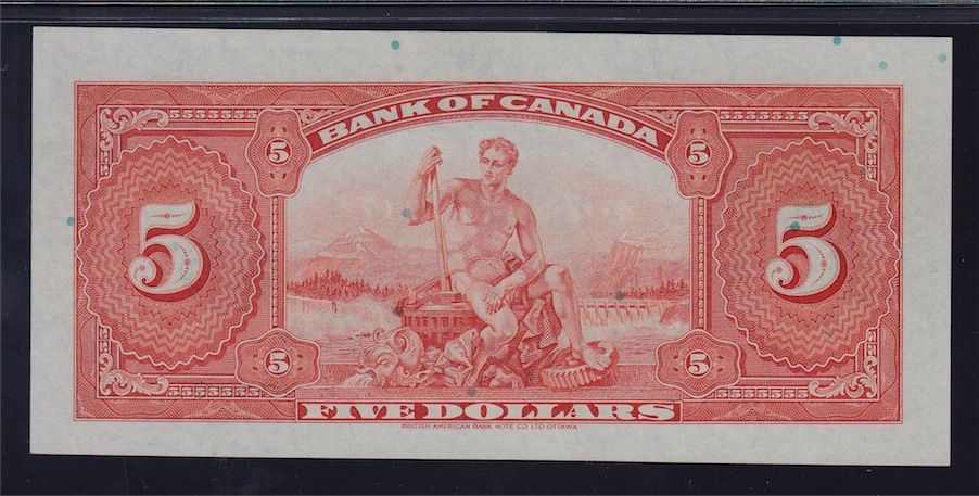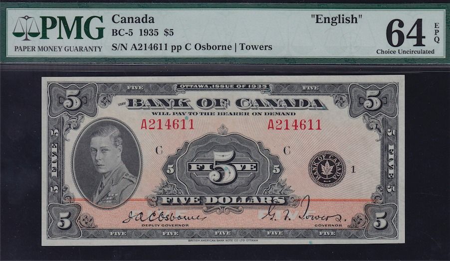1935 Bank of Canada $5. BC-5, Exceptional quality, PMG UNC-64 EPQ. S/N:A214611/C.