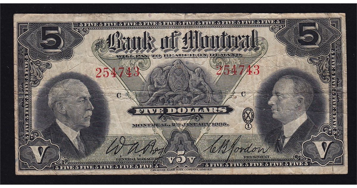 1935 Bank of Montreal $5 - CH 505-60-02, Fine, S/N:254743/C.