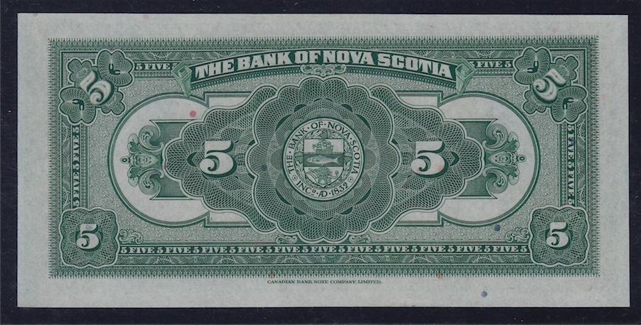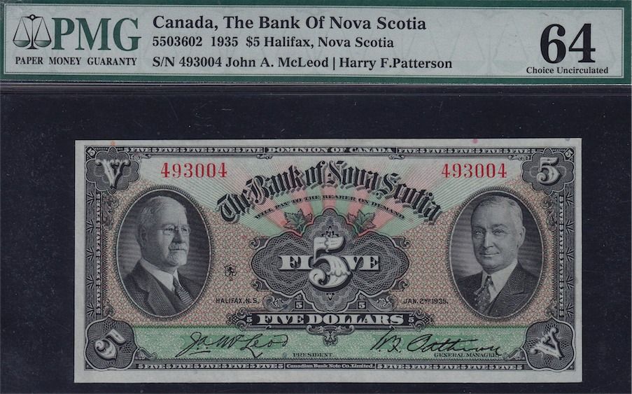 1935 Bank of Nova Scotia $5. CH 550-36-02, A $5 of 1935 from one of Canada's most popular banks. Graded "Choice Uncirculated 64" by PMG. S/N:493004.