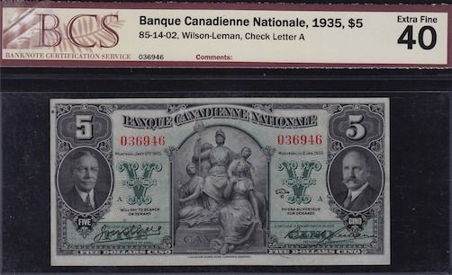 1935 Banque Canadienne Nationale $5 - CH 85-14-02, BCS Extra Fine 40, S/N:036946/A.