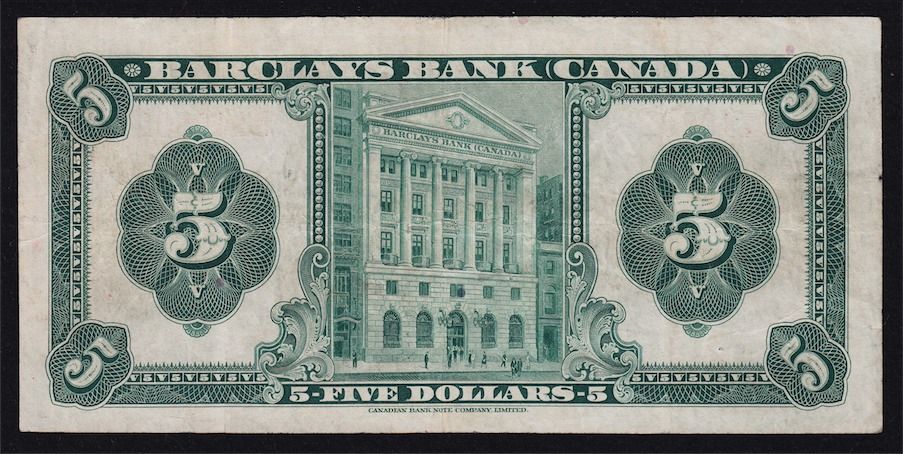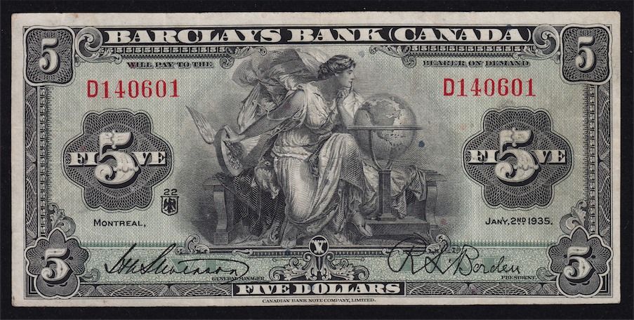 1935 Barclay's Bank $5. CH 30-12-02, VF, S/N:D140601.