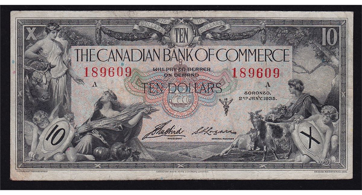 1935 Canadian Bank of Commerce $10 - CH 75-18-06, VF, pressed, S/N:189609/A.