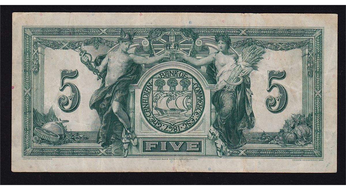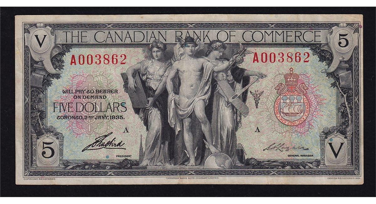 1935 Canadian Bank of Commerce $5 - CH 75-18-02, VF, pressed, S/N:A003862/A.