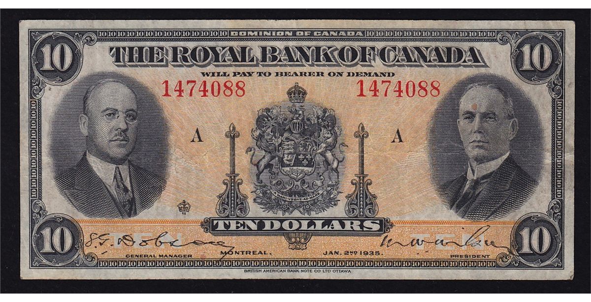 1935 Royal Bank of Canada $10 - CH 630-18-04a, VF, pressed, S/N:1474088/A.