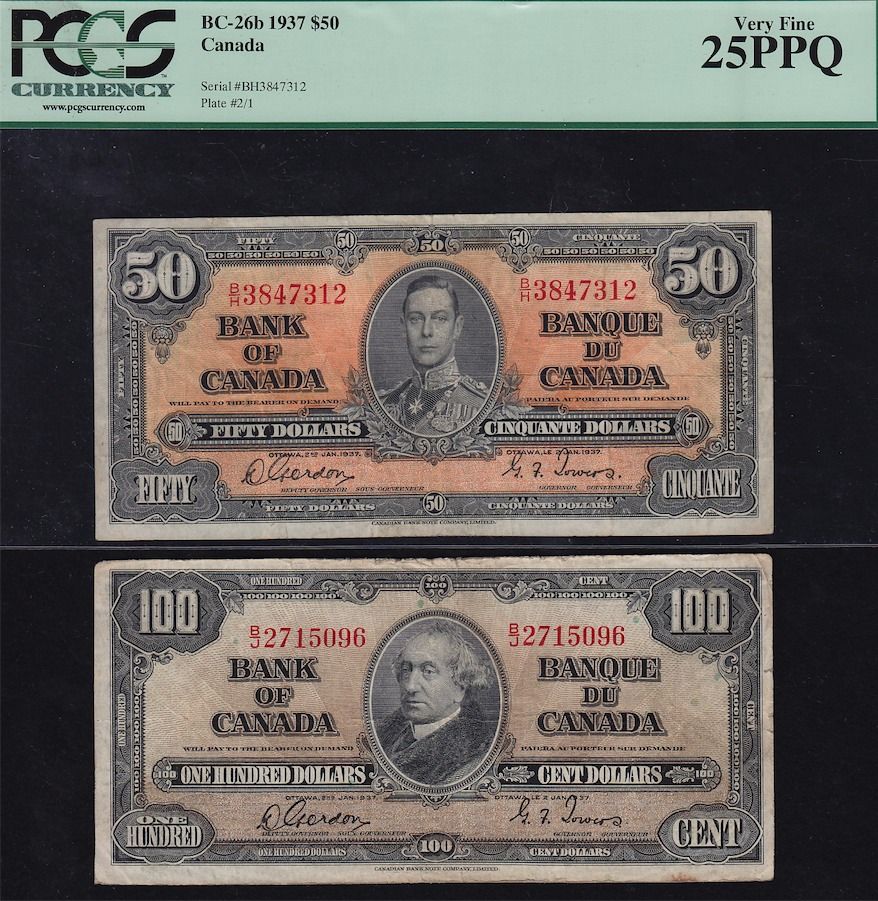 1937 Bank of Canada $1 - $100 Set. Conditions F-EF, viewing is recommended, good value. 7 Pcs.
