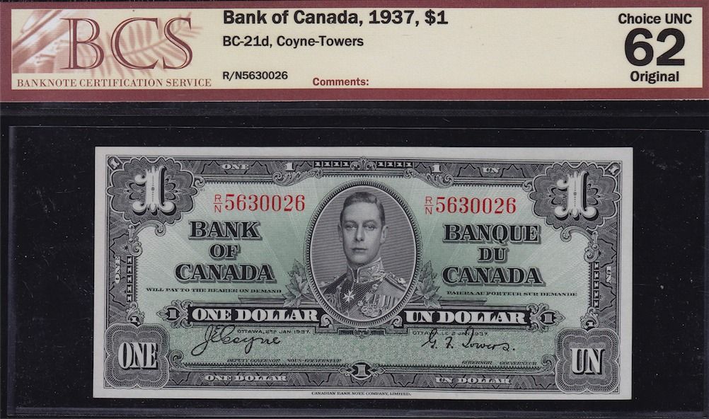1937 Bank of Canada $1 - CH BC-21d BCS Choice UNC62 Original. S/N:R/N5630026