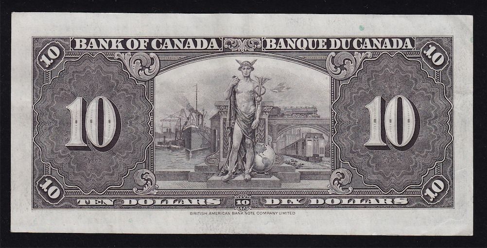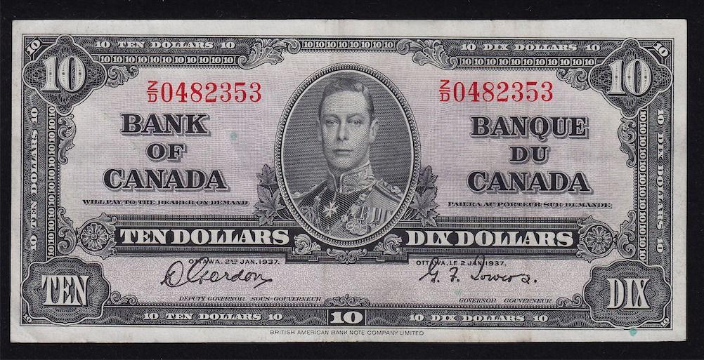 1937 Bank of Canada $10 - CH BC-24b. tough prefix, nice original EF/AU. S/N:Z/D0482353.