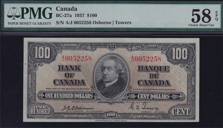 1937 Bank of Canada $100. BC-27a. PMG AU58 EPQ, the touched corners likely kept it from being an UNC. S/N:A/J0052258.