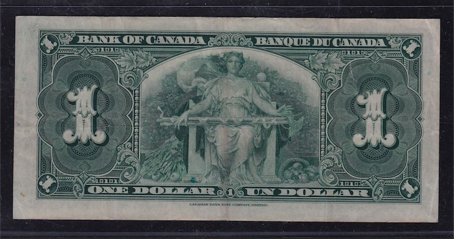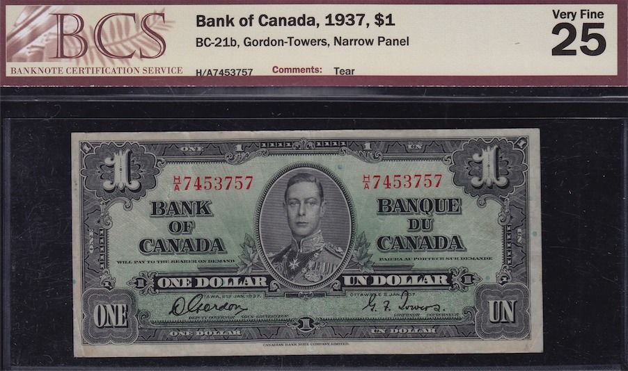 1937 Bank of Canada $1. BC-21b, Narrow Panel, BCS VF25, tear, S/N:H/A7453757.