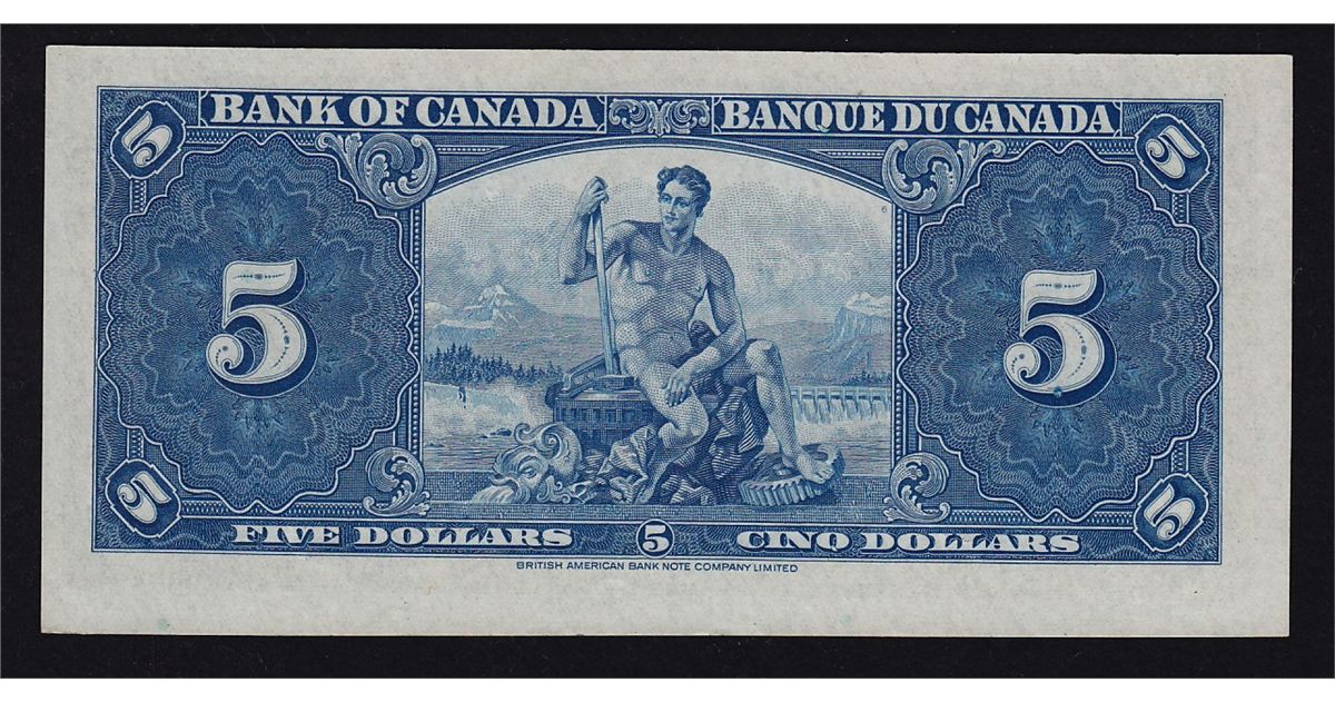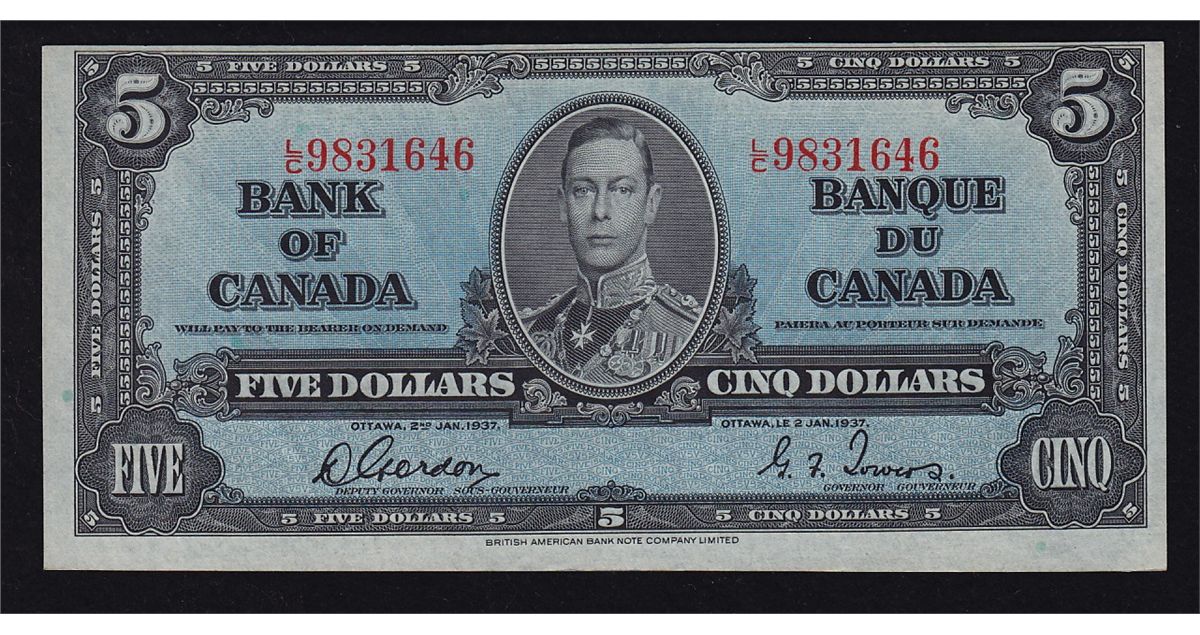 1937 Bank of Canada $5 - CH BC-23b, AU-Unc, off center, S/N:L/C9831646.