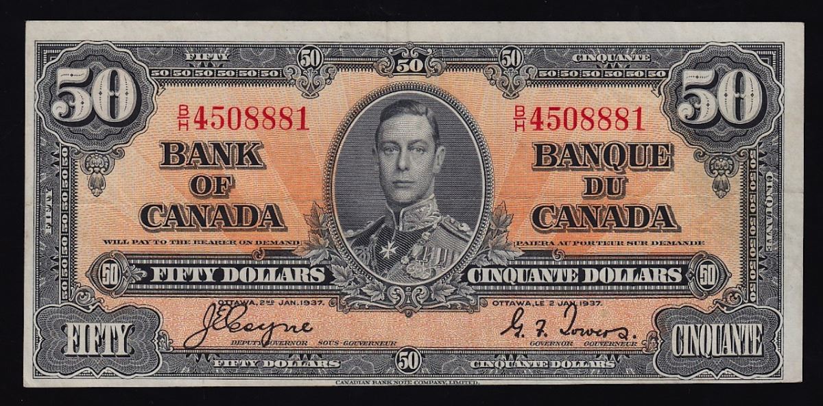 1937 Bank of Canada Fifty Dollars - CH BC-26c. Pressed VF. S/N: B/H4508881.